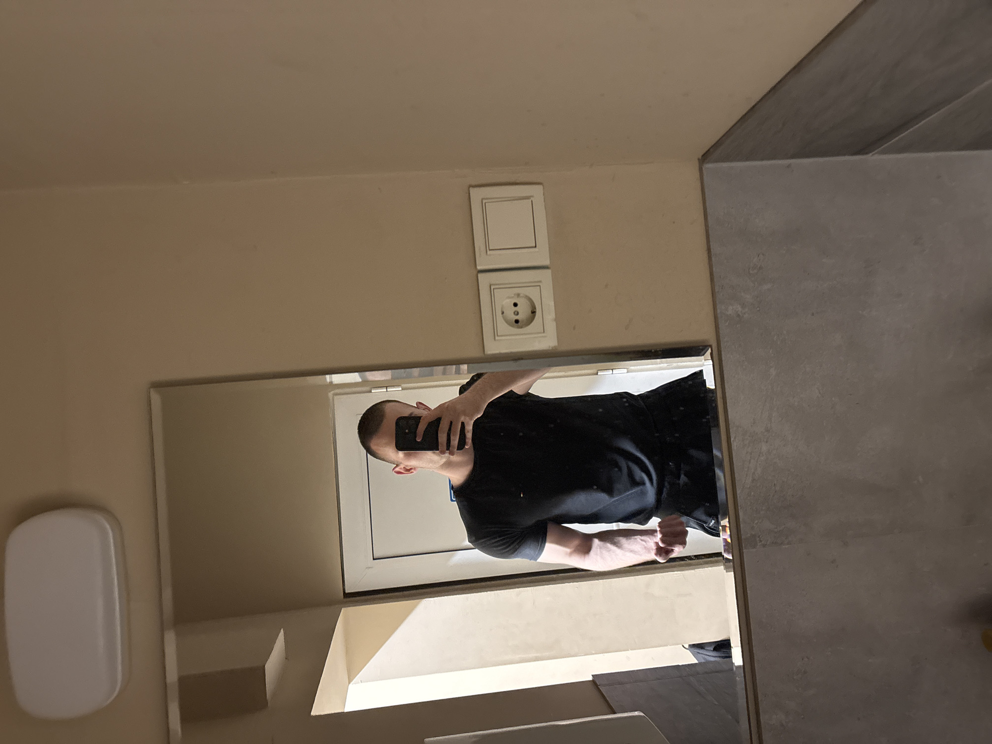 The image displays an indoor mirror selfie taken in the city of Montana, Bulgaria. A male subject with a short buzz cut, wearing a black t-shirt and dark shorts, is reflected in a vertical rectangular mirror. He holds a black smartphone in his right hand, obscuring his upper face. His left arm is flexed, with the hand clenched into a fist, exhibiting pronounced veins on the forearm. The mirror's reflection shows a white door frame behind the subject, with a partially open white door leading to a brightly lit area. An oval white ceiling light fixture is visible reflected on the beige ceiling above. To the right of the mirror, on a beige wall, a white European-style electrical power outlet and an adjacent white rectangular light switch are mounted. A gray, textured countertop extends horizontally beneath the mirror at the bottom of the frame.