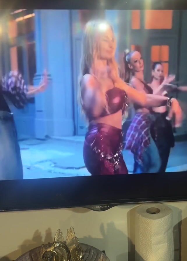 A TV displays a music video with a group of women dancing. The central figure is a blonde woman in a shiny pink top and pants, while the other dancers wear a variety of outfits including tops with jeans or flared pants. They are on an outdoor set resembling a street, with building facades in the background. Below the TV is a small, ornate bowl with a golden dog figurine, a roll of paper towels, and a small tin container. The camera angle is slightly low, capturing both the TV screen and the items on the surface below. The TV is a HITACHI brand.