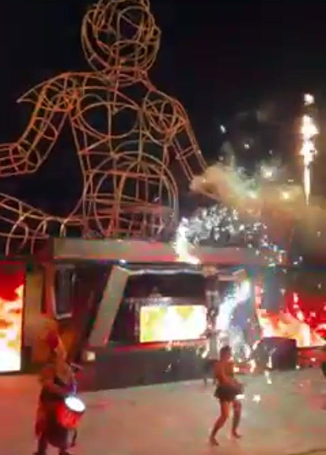 At night, the scene shows a stage show with a large metal statue of a person seated on top of the stage. Firework-like sparks and flames erupt from the front of the stage. Three dancers are on the ground. One dancer, to the left, plays a drum. The other two dancers twirl with lit sparklers. Behind the dancers is the stage. The stage displays red and orange graphic lighting on large screen panels. A DJ can be seen in the center of the stage. The area where the crowd is located is dark and only the ground tiles are visible.