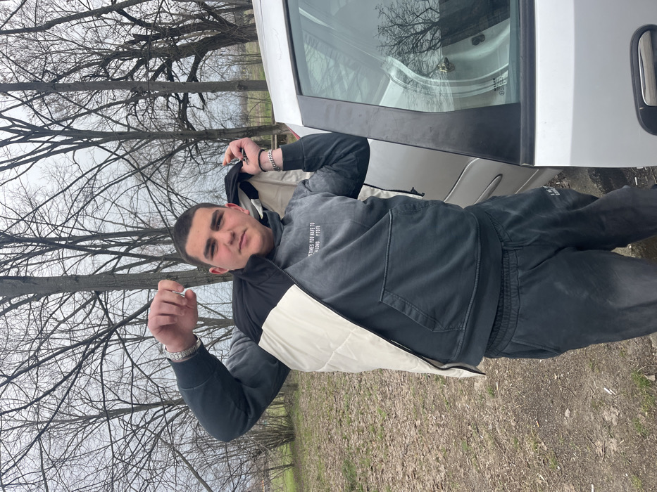 The scene is an outdoor setting in Stara Zagora, Bulgaria, under an overcast sky, with leafless deciduous trees in the background suggesting late autumn, winter, or early spring. A young adult male stands centrally, facing the viewer with a neutral expression. He has short, dark hair. He is dressed in a black and off-white quilted vest, partially unzipped, worn over a faded dark grey hooded sweatshirt with white text on the chest that reads "SOMETIMES YOU HAVE TO ALONG YTOF". He also wears matching dark grey sweatpants. A silver-colored link bracelet is visible on his left wrist. On his right wrist, he wears a dark cord bracelet and a silver-colored link bracelet. His left hand is raised, holding a small white cylindrical object, consistent with a cigarette, between his index finger and thumb. His right hand grasps the collar of his vest or sweatshirt. He is positioned alongside the passenger side of a light-colored vehicle, likely a car, with a portion of its door frame and window visible on the right side of the frame. Reflections of the surrounding trees are visible in the car's window. The ground beneath him is exposed soil with sparse dry vegetation.
