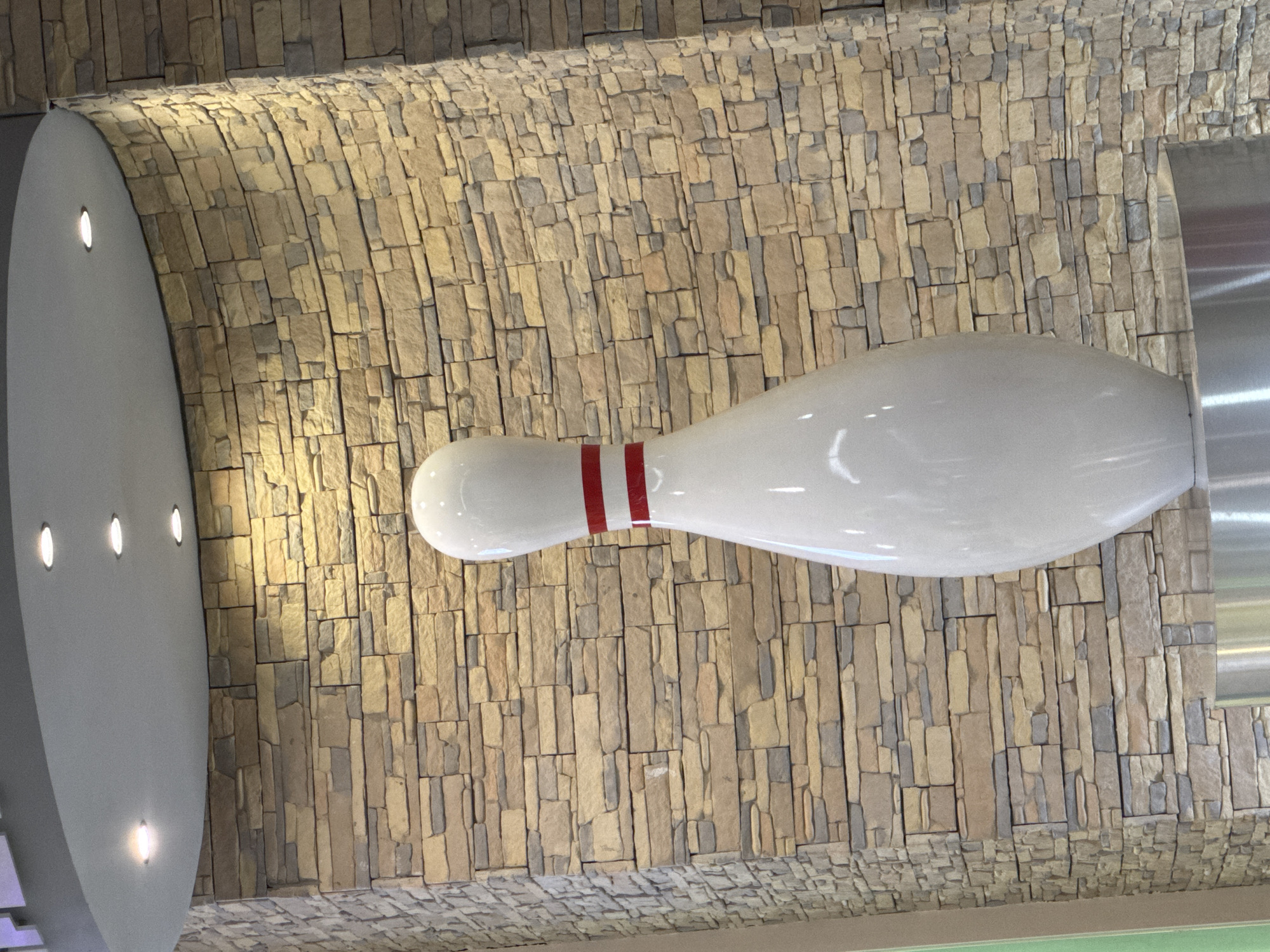 A low-angle, full shot depicts a bowling pin-shaped sculpture against a textured wall, likely an indoor commercial space. The wall is covered in small, rectangular stone tiles of varying shades of beige and gray. The sculpture is white with two red stripes near the top, resembling a standard bowling pin, and a metallic extension on the right side. The image also captures the corner of a rounded, gray architectural feature with four evenly spaced lights, positioned to the left of the bowling pin sculpture. The location and city are unknown.