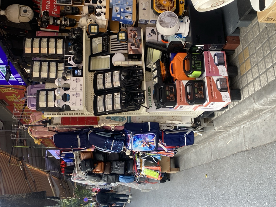 A street market display shows security cameras, various outdoor lighting fixtures, fans, and portable power stations on top shelves