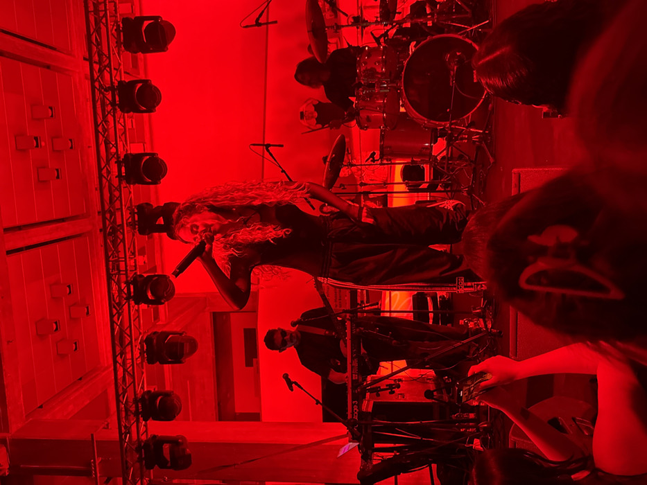 An indoor musical performance is depicted on a stage in Tel Aviv, Israel, bathed entirely in intense red stage lighting that renders the scene monochromatic. A female vocalist, characterized by long, curly hair and dressed in a dark tank top and dark baggy pants with white side stripes, stands center-stage, actively singing into a handheld microphone. To her left (viewer's right), a male musician wearing sunglasses plays an electric guitar, positioned near a keyboard labeled "stage 3" on a stand. To her right (viewer's left), further back on the stage, a second male musician is seated behind a multi-piece drum kit. Overhead, a metal truss system supports an array of stage lights, all emitting red light. The lower foreground shows the blurred tops of heads and raised hands of several audience members, with one individual holding a smartphone vertically, seemingly recording the event.