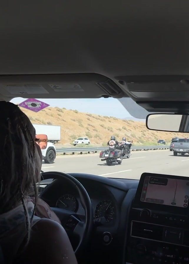 The view from inside a moving car shows the driver, a person with light-colored braided hair and a light-colored top, driving on a highway. The driver is female. There is another person in the passenger seat. Motorcycles are passing the car. Other cars and trucks are also driving on the highway. The interior of the car includes a navigation screen, a rearview mirror, and front seat headrests. The outside environment appears to be a desert landscape with hills and clear skies. Wind turbines are visible in the distance. The car is moving at highway speed. Music is playing in the car.