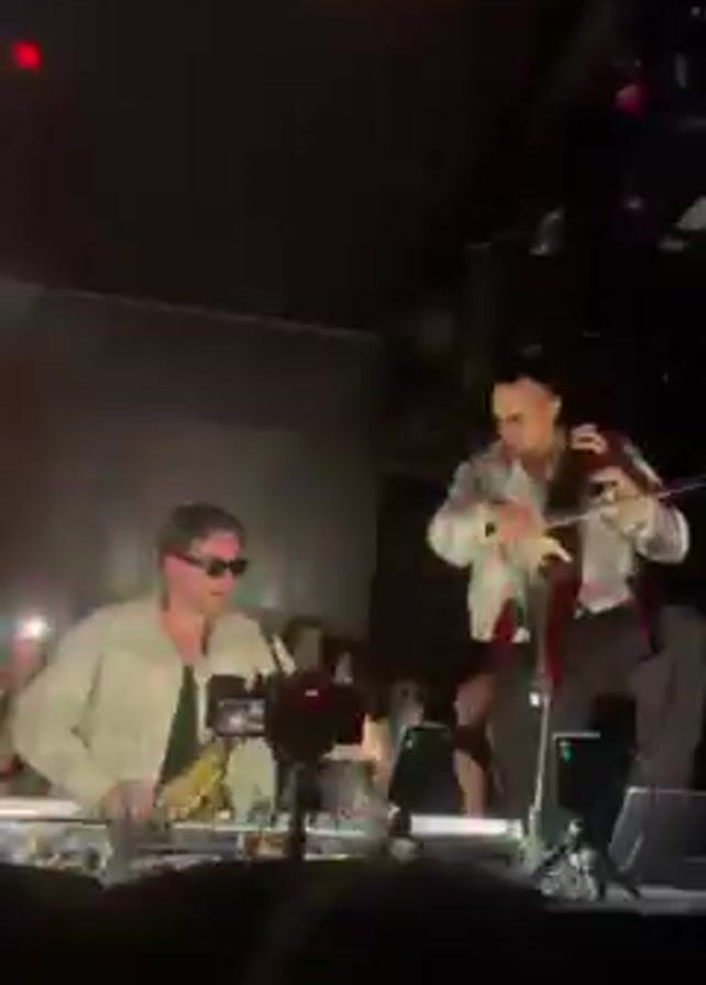 Two men perform on stage at a concert. On the left, a DJ wearing sunglasses and a light-colored jacket mixes music on a console. On the right, a cellist wearing a light jacket and dark pants plays their instrument while dancing. The stage is dark, but bright lights illuminate the performers. Behind them, a screen displays "Lukas and Frank." The audience is visible, with some people recording the performance on their phones. The overall atmosphere is energetic and lively.