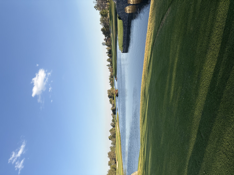 A verdant golf course landscape features a water hazard running lengthwise, bordered by trees and greenery