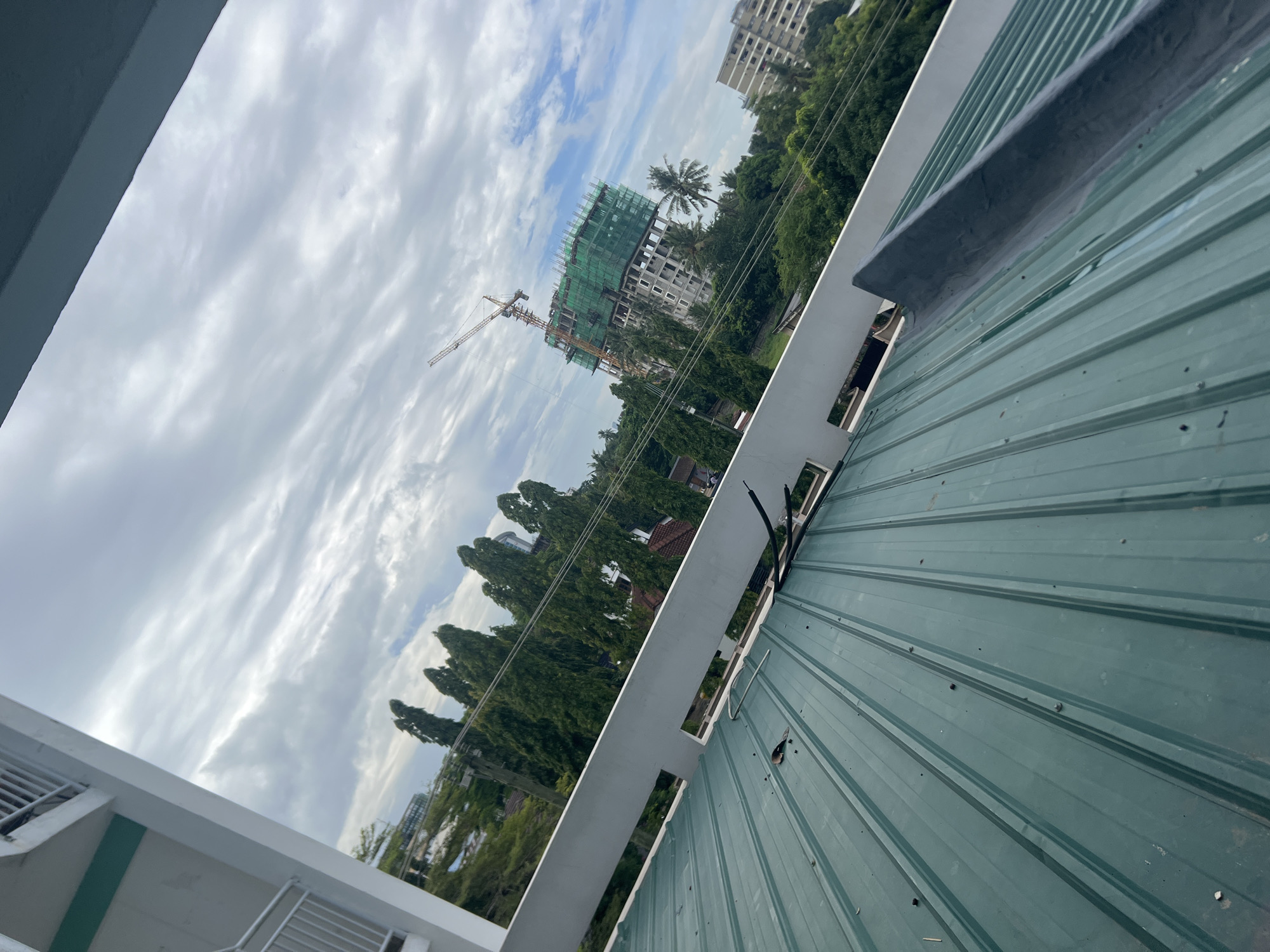 The image presents an elevated view over a dark green corrugated metal roof towards a cityscape in Dar es-Salaam, Tanzania, under an overcast sky. In the foreground, a dark green corrugated metal roof spans the lower portion of the frame, showing faint streaks, dust, and minor debris such as small leaves and dark particles. A dark grey/black section of roofing or flashing is visible along the right edge of this roof. A white concrete parapet wall or railing runs horizontally across the mid-ground, separating the immediate foreground roof from the distant urban landscape. To the far left, a segment of a white building wall with a white railing is partially visible, suggesting the viewpoint is from an adjacent structure. The background cityscape is dominated by lush green tropical vegetation, including numerous tall, slender trees and at least one palm tree. Several buildings are visible amidst the foliage. Prominently positioned is a multi-story building under construction, characterized by its exposed concrete framework, with several upper levels enveloped in green safety netting. A tall yellow tower crane is affixed to the side of this construction, extending above it. Further to the right, another multi-story building with a light-colored facade is visible. Utility lines or power cables are observed crossing the scene horizontally, strung between poles and trees. The sky above is largely cloudy, featuring stratocumulus-like formations with areas of lighter and darker grey clouds, interspersed with small patches of blue sky. No individuals are visible in the scene.