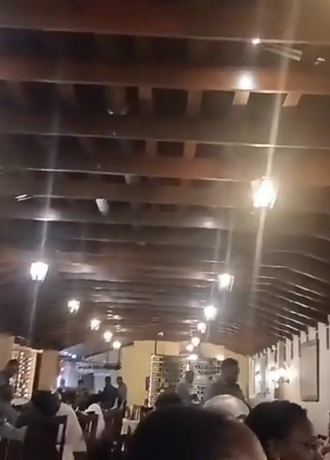 busy restaurant with many patrons seated at tables, eating and talking. The restaurant has a high, vaulted ceiling with exposed wooden beams and decorative lighting. The walls are painted white and adorned with framed artwork and sconces. A waiter is seen carrying a tray of drinks. The atmosphere appears lively and social.