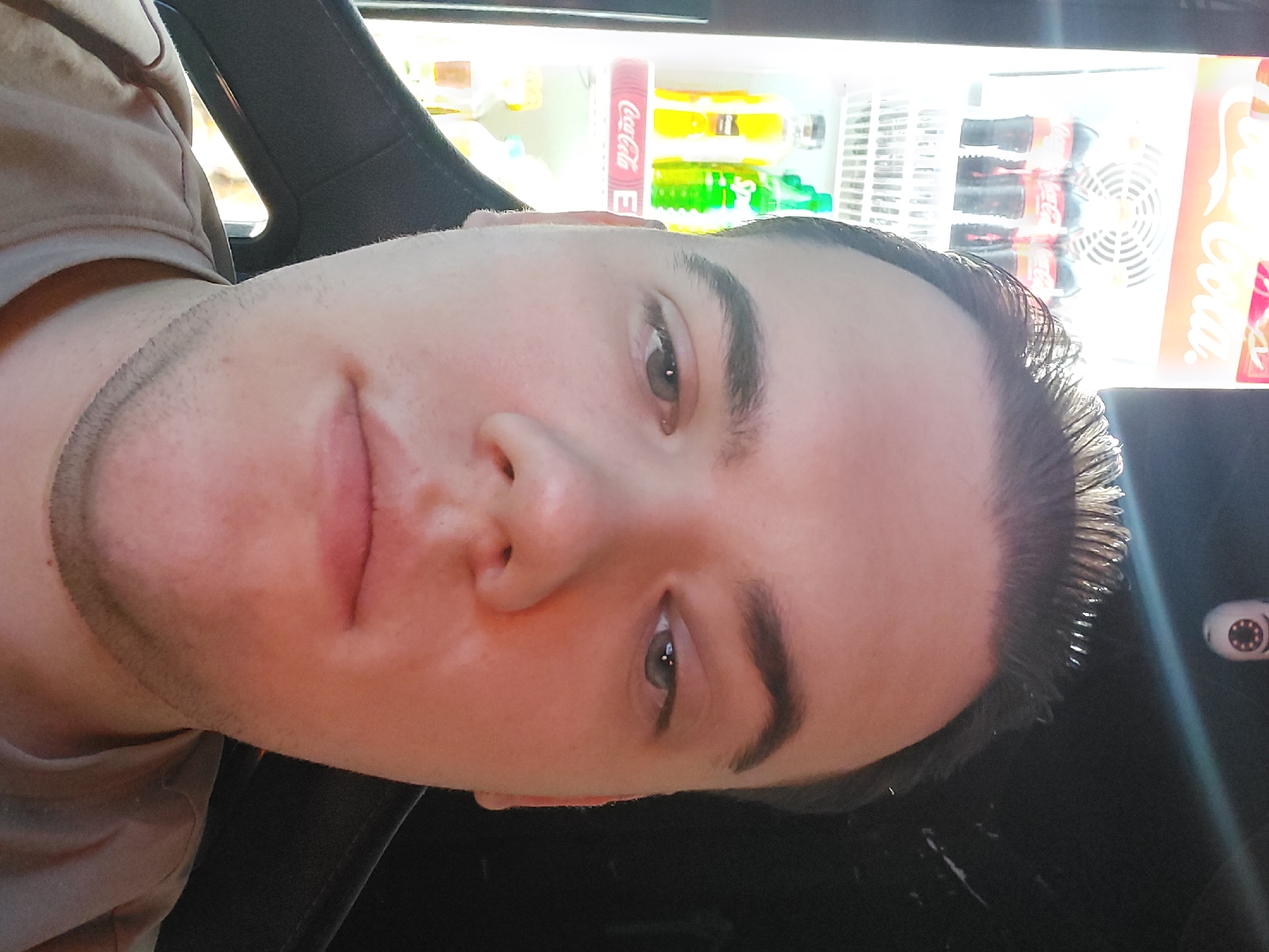 A man is taking a selfie. He is positioned in front of a refrigerated display case filled with beverages, including Coca-Cola products. He is sitting in what appears to be a car. The location is likely a shop in Tashkent, Uzbekistan based on the language on the products and the background.
