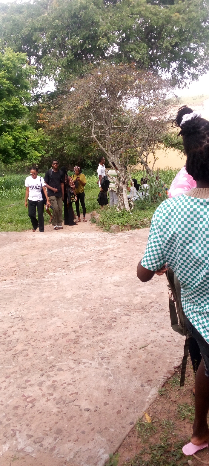 group of people walking on a dirt path in Okigwe, Nigeria. There are six people in the image, all walking in the same direction. The person in the foreground, wearing a green and white checkered shirt and black pants, is standing with their back to the camera. The other five people are walking away from the camera, and they are dressed in casual clothing. The path is surrounded by trees and grass. The sky is overcast. The image was taken at a location in Okigwe, Nigeria, that has a latitude of 5.824 and a longitude of 7.396.