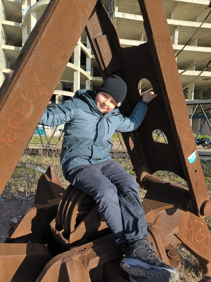 An outdoor scene in Perazića Do, Montenegro, depicts a young male seated on a large, heavily rusted piece of industrial machinery, likely a component of a crane or excavator. The individual, appearing to be a child, faces forward with a slight smile, wearing a black beanie, a two-tone blue and teal winter jacket, dark grey pants, and black and grey athletic or hiking shoes. His hands grip the upright, rusty metal beams on either side of his body, maintaining his position on a central cylindrical section of the machinery. The large metal object shows significant surface rust and appears static. In the background, under clear daylight conditions, stands a large, multi-story, unfinished or abandoned concrete building, characterized by exposed rebar and a distinctive curved architectural element. The ground beneath the machinery consists of dry vegetation and earth.