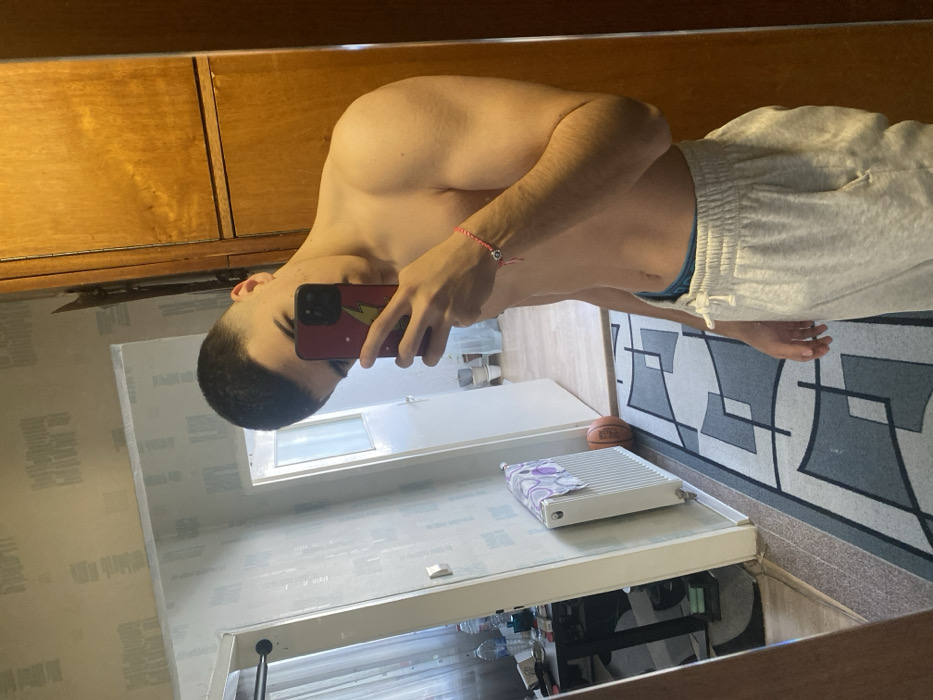 A young male individual, shirtless and wearing light grey sweatpants with a blue underwear waistband visible, is depicted taking a mirror selfie within a residential interior in Kyustendil, Bulgaria