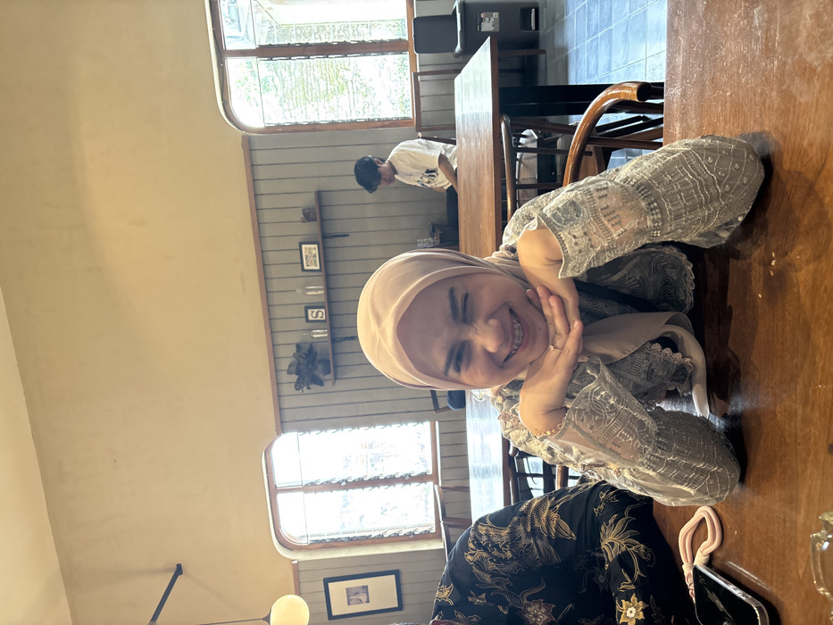 A young woman wearing a light-colored hijab smiles with her hands framing her face. She sits at a wooden table in what appears to be a restaurant or cafe. Behind her, a person in a white shirt is partially visible at another table. The interior features windows and decor with vintage-style elements. Another partially visible person is seated to her left, wearing a floral shirt. The scene is well-lit.