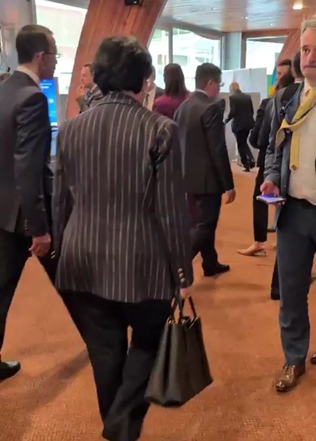 busy hallway with many people dressed in business attire. They are walking in various directions, some carrying bags or holding phones. The environment appears to be a conference or convention center, with carpeting and wooden wall accents. The people are of varying ethnicities and ages. The overall tone is professional and active.