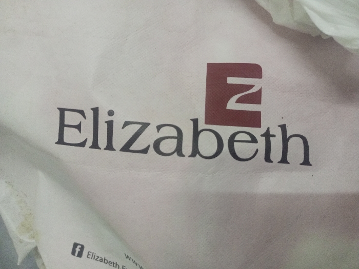 The image displays a close-up of a crumpled, off-white non-woven fabric bag, depicted as being in the city of Zee Pin Kone, Myanmar. Centered on the bag is the word "Elizabeth" rendered in a dark gray serif typeface. Above and slightly to the right of this text, a dark reddish-brown square emblem contains a white, stylized letter "E". In the lower-left quadrant, a partial Facebook logo is visible, accompanied by the text "Elizabeth.f" and the beginning of a web address "www.". The fabric exhibits subtle creases and minor surface variations. No people, specific actions, or environmental context beyond the bag are discernible.