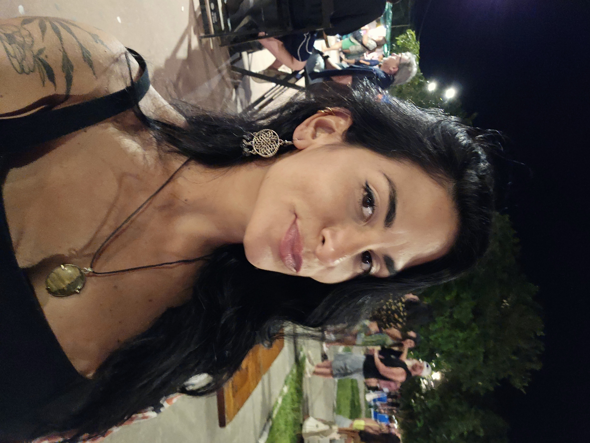 The image displays a woman in a close-up selfie shot at night in an outdoor public area of Armação dos Búzios, Brazil. The woman, positioned prominently in the foreground, has dark, wavy hair, brown eyes with visible eyeliner, and light-colored lipstick. She wears a black strap top, an ornate, circular metal earring with small dark beads in her left ear, and multiple gold-toned hoop piercings in her upper left ear cartilage. A dark cord necklace with a large, irregularly shaped, multi-faceted pendant of a brown-gold hue rests on her chest. A tattoo depicting botanical elements is visible on her left upper arm/shoulder. The background is a nighttime outdoor setting, dimly illuminated by artificial overhead light sources. In the mid-ground left, individuals are seated at tables; one man with gray hair and glasses, wearing a dark jacket, is visible in profile, facing right. In the mid-ground right, a group of individuals stands and interacts; a man wearing a white baseball cap, dark sleeveless shirt, and light shorts is discernible among them. Dark green foliage of trees is visible against the dark night sky. A long, dark-stained wooden bench runs horizontally across the lower right frame. The ground surface is a light-colored paving, indicative of a public gathering or market environment.