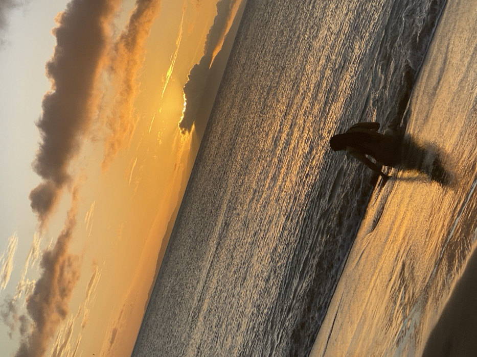 A beach scene bathed in golden light, likely during sunset or sunrise