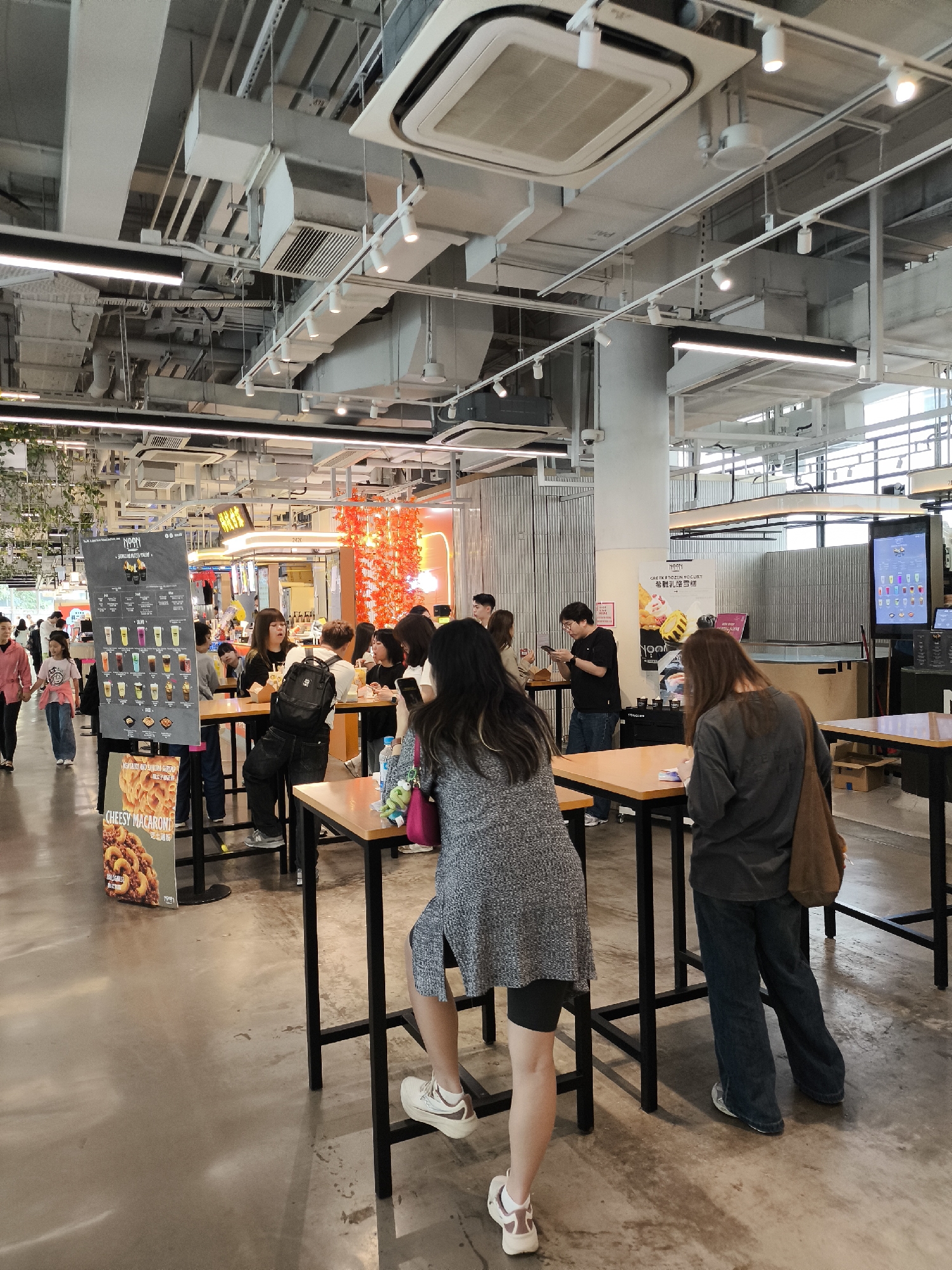 The image portrays an interior view of a contemporary food court or casual dining area within a commercial complex in Hong Kong, China. The ceiling exhibits an industrial-chic design with exposed white-painted ventilation ducts, utility conduits, and a variety of track lighting fixtures, including spotlights and linear strips. The floor is light grey concrete. Approximately 15-20 individuals, predominantly East Asian adults and young adults, are present. In the immediate foreground, a woman wearing a grey patterned cardigan and black shorts/leggings stands with her back to the camera, positioned next to a tall, rectangular wooden table with a black metal base. To her right, another woman in a dark grey long-sleeved top and dark blue jeans stands facing a similar table, carrying a brown shoulder bag. In the mid-ground, several groups are gathered around identical tall tables, engaging in dining, conversation, and interacting with mobile phones. A man in a black t-shirt and jeans stands, focused on his phone. On the far left, two individuals, one in a pink shirt and another person (possibly a child) in a white t-shirt, walk towards the background. Key objects include a prominent black A-frame sign displaying the "NOAM SANGUO YOUTH YOGHURT" menu and an advertisement for "CHEESY MACARONI." Multiple digital display screens showing menus are visible. A distinctive orange-red decorative element, resembling hanging leaves or lanterns, is situated in the mid-background. A CCTV camera is mounted on a white pillar on the left. Large windows or glass partitions in the background indicate ambient light from outside. The scene depicts a busy, modern, and casual dining atmosphere.
