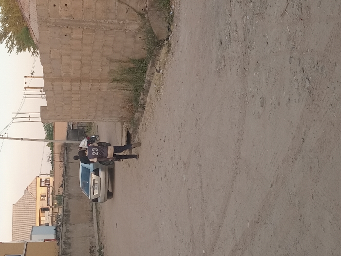 A dirt road is flanked by walls and buildings. A silver car sits in the road with two people nearby, one wearing a jersey with the number 23. Power lines stretch across the sky. Vegetation sprouts between the road and a wall. The scene appears to be in a residential area.