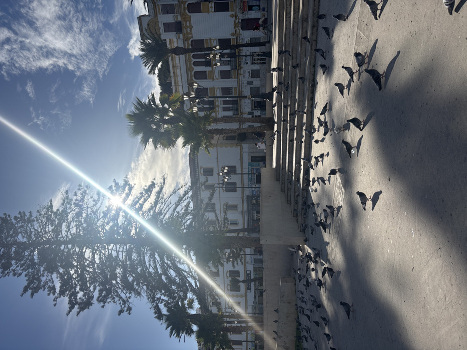 The image displays a sunlit urban square, identified as Place du 9 Avril 1947 (Grand Socco), in Tangier, Morocco. The scene is illuminated by direct sunlight, casting long, distinct shadows and producing a prominent diagonal lens flare across the upper left portion of the frame. The sky is bright blue with scattered wispy white clouds. The foreground and midground of the square are paved with concrete, upon which an estimated 70-100 pigeons are scattered. These pigeons, primarily grey with some variations in plumage, are observed standing, walking, and pecking at the ground. Their individual shadows are elongated due to the low angle of the sun. To the right, a multi-tiered concrete staircase descends into the plaza, while a low concrete barrier or planter wall delineates the left side of the foreground. In the background, two multi-story buildings line the square. The building on the left is primarily white with dark-framed windows and balconies. The building on the right is more ornate, featuring white facades with yellow-gold decorative trim, multiple balconies, and arched windows. Several ornate black streetlights are visible, some freestanding and others affixed to the building facades. A large, tall coniferous tree stands prominently on the left, partially obscuring the building behind it. Several smaller palm trees are interspersed across the midground. Few human subjects are present. One individual sits on the upper steps on the right side of the staircase. Another person is partially visible near the base of the left background building. A third, distant figure can be seen on the far right side of the plaza. No direct interactions between humans and pigeons are discernible. The overall environment presents a common public gathering space on a bright day.