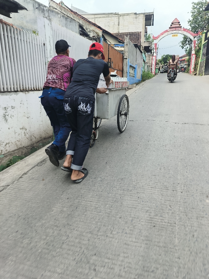 - "Two men are actively pushing a light-colored, two-wheeled street vendor cart uphill on a paved road in Cimenyan, Indonesia, under an overcast sky" by FM-HIIxC2, licensed under CC BY 4.0