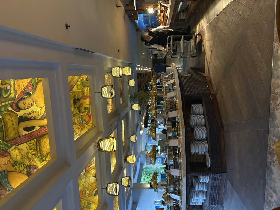 A vibrant buffet is depicted in the photograph. Artwork adorns the left wall, illuminated by a row of decorative light fixtures. Various food warming trays line the buffet, alongside stacks of white plates. A server in uniform stands at the end, possibly refilling or assisting. The floor is dark wood, complementing the overall warm and inviting ambiance.