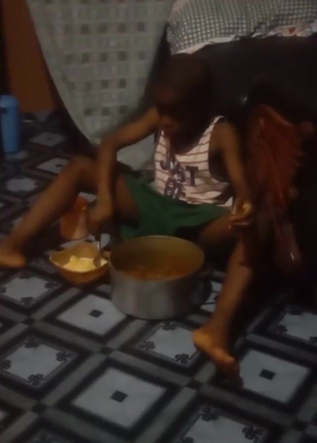 A young barefoot boy is sitting cross-legged on a patterned tile floor. He is wearing a white tank top with red and navy stripes and green shorts. In front of him is a metal pot and a small yellow bowl. The boy is eating from the bowl with a utensil. Behind him is a dark chair and a light-colored curtain or sheet hanging down. A blue bottle is visible to the left.