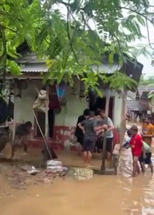 A video shows a flood in a neighborhood. Brown, muddy water covers the ground, partially submerging the lower parts of buildings and fences. Several individuals, including children, are wading through the water. Some are gathered near a house, seemingly working together to move or secure something. Trees are visible in the foreground, and houses extend into the background, suggesting a densely populated residential area.