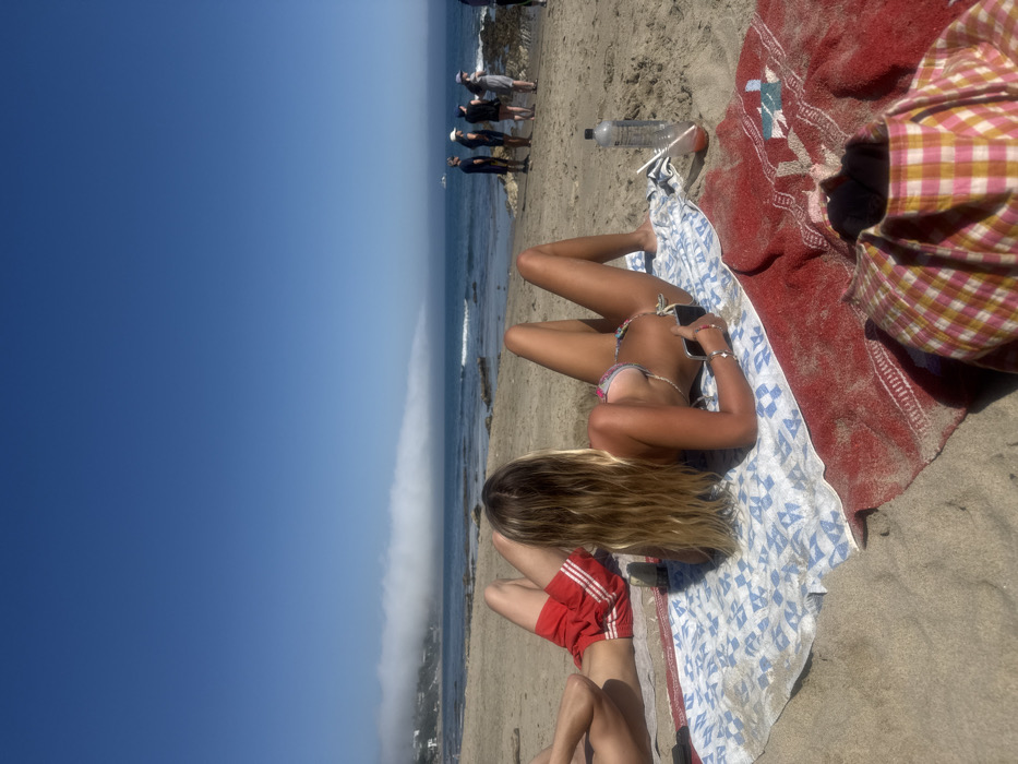 The scene depicts a sunny day on a sandy beach in Malibu, United States of America. In the foreground, two individuals are seen lying on towels on the sand. To the left, the lower torso and legs of a person wearing red shorts with white stripes are visible, resting on a blue and white patterned towel. To the right and slightly in front, a female with long blonde hair is lying face down on a similar blue and white patterned towel, wearing a multi-colored bikini. She holds a dark smartphone in her right hand. Beside her, to the right, a red towel with a white design is spread on the sand, next to which a clear plastic bottle containing a red liquid and a straw stands upright. A plaid shirt (red, yellow, white) is partially visible in the bottom right corner. The sand is light brown. In the mid-ground, the ocean is visible with gentle waves breaking on a rocky shoreline. In the background, a distinct low-lying bank of fog or marine layer extends horizontally across the coastline, partially obscuring distant hills and structures to the left. Overhead, the sky is clear and bright blue. To the far right, a small group of approximately five to seven individuals is standing near the water's edge. Further out on the horizon, a white boat is visible on the water.