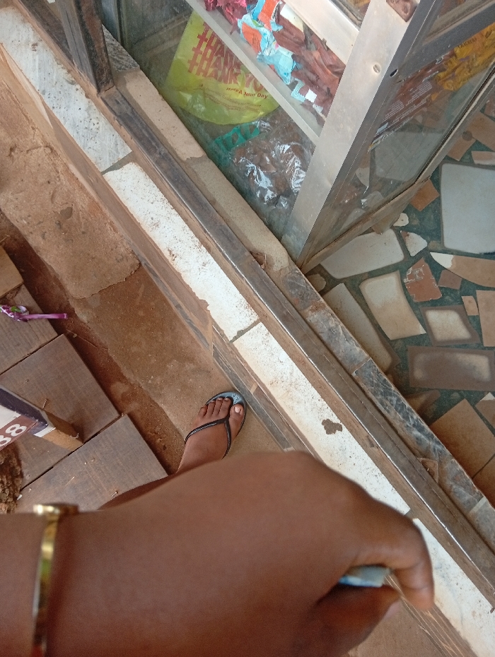The scene depicts a high-angle view, likely at a storefront or kiosk in Ugbowo, Nigeria. In the foreground, a dark-skinned forearm, adorned with a gold-colored bracelet, extends into the lower right, holding a small, light-colored cylindrical object. A bare foot, with painted toenails, wearing a black flip-flop with a light blue strap, rests on a tiled surface to the left. This tiled surface consists of irregular brown and grey segments. A low, diagonal structure, constructed from a metal frame and a concrete or tiled base, separates the immediate foreground from a background display area. Behind this structure is a glass display case containing various commercial goods. Observable items within the display case include a yellow plastic bag printed with "THANK THANK THANK Have A Good Day," along with multiple packaged items, some in clear plastic. The floor beyond the display case is a mosaic of irregularly shaped, light-colored tiles.