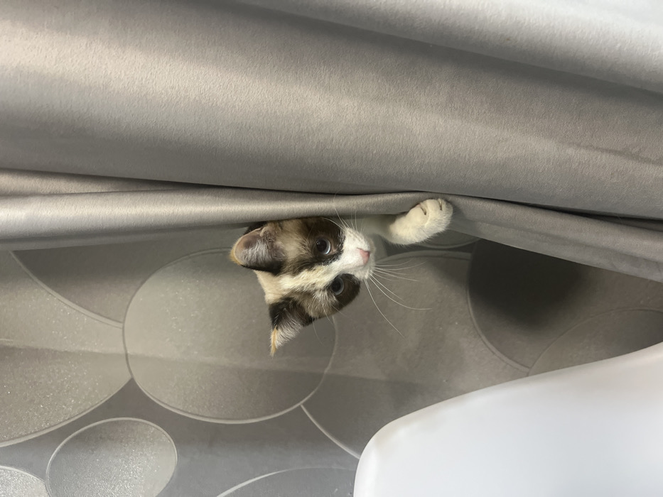 An indoor photograph captures a feline subject, identified as a calico-point cat, exhibiting white fur with distinct brown-black markings on its ears, around its blue eyes, and across its nose. The animal's head is observed tilted, protruding from behind a light grey, vertically pleated curtain. Its anterior left paw is visible, making contact with the curtain fabric. The wall in the background, to the left of the curtain, is covered with grey wallpaper featuring a repetitive pattern of overlapping, lighter grey circular motifs. A white, opaque, curved object, indistinct in form, occupies the lower-left quadrant of the frame. No human subjects are present. The environmental context indicates a domestic interior. The precise geographic location within Votkinsk, Russia, is not discernible from the provided visual data.