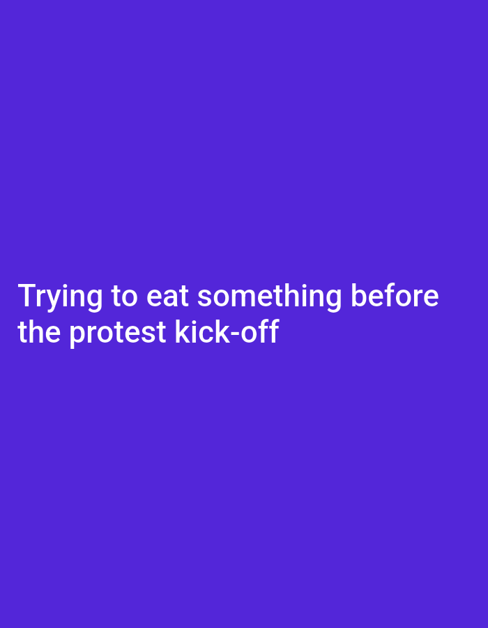 The image is a plain purple background with the text "Trying to eat something before the protest kick-off" in white font