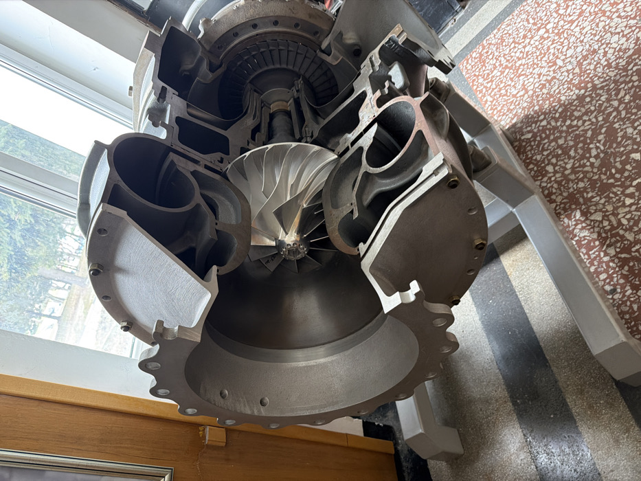 A cutaway display model of a gas turbine or jet engine, fabricated from matte grey metallic components, is centrally positioned indoors