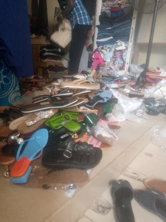 The scene depicts an indoor retail environment, likely a shop or market stall, located in Arawa, Nigeria. The light-colored tiled floor is largely obscured by a dense and disorganized scattering of numerous footwear items, predominantly sandals and shoes, in various styles, sizes, and colors including black, brown, beige, blue, green, orange, and silver. Many items appear new, with several still enclosed in clear plastic packaging. In the background, a person wearing a blue and white plaid shirt and dark trousers is partially visible, holding a light-colored handbag at chest height. To their immediate left, the lower body of a second individual is visible, dressed in dark blue trousers and a blue patterned fabric. Behind these individuals, shelving units and a wooden stand are visible, heavily stacked with folded clothing items in various colors. A black electric fan is partially visible on a wall shelf in the upper right quadrant of the image. The area suggests an active merchandise display or sorting zone.