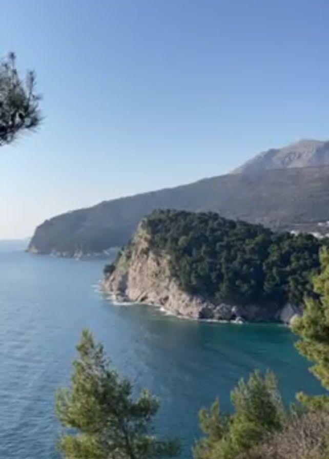 scenic coastal view on a sunny day. The clear blue sea is visible, with land masses extending into the water on either side. A large rock formation covered in lush green trees juts out into the water. Further in the background, a mountain range is visible against a clear blue sky. Some pine trees are visible in the foreground, slightly obstructing the view.