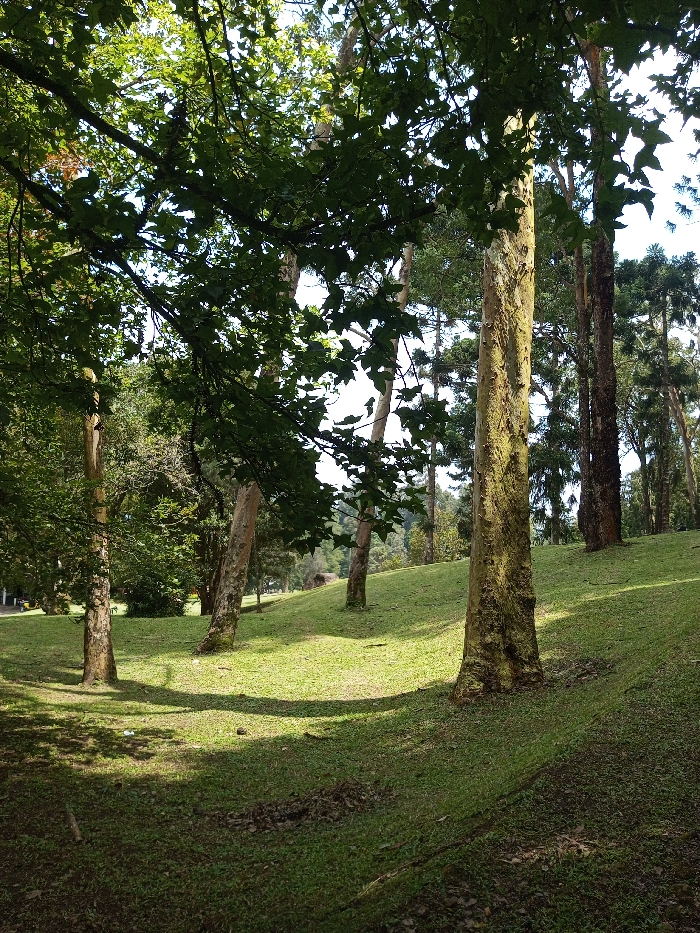 The image depicts a sunlit, wooded landscape in Serchhip, India, characterized by undulating grassy terrain and numerous trees under a bright sky. In the immediate foreground, dark green broadleaf foliage, exhibiting lobed leaves, partially obscures the upper frame and casts deep shadows across a downward-sloping grassy area. This foreground area contains a small, light-colored object and a patch of disturbed earth. The midground features an upward-sloping, well-maintained grassy hill illuminated by direct sunlight, creating distinct shadows from surrounding trees. Multiple tree trunks are prominent; a thick, light-colored tree trunk in the mid-right shows vertical striations and moss-like growth. Other trees with lighter and darker bark stand on the slopes, extending into a denser forest in the background. A faint paved path is visible on the far-left edge of the scene. No individuals, animals, or additional man-made structures are present.