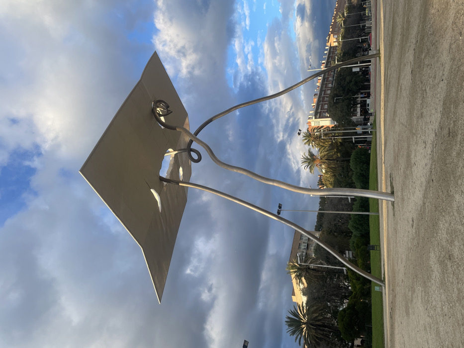 A modern sculpture dominates the frame, featuring a large, off-white, angled square suspended by curved metal poles. Circular cutouts punctuate the square's surface, suggesting eyes and a mouth. Background includes rows of buildings, palm trees, streetlights, and cloudy blue sky. The base is a light gray concrete surface, positioned at the bottom and right sides of the image.