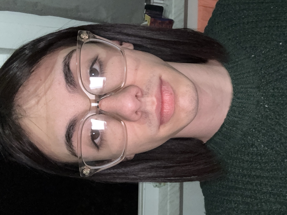 This image is a headshot of an individual in an indoor setting in Dresden, Germany. The subject has dark, straight, shoulder-length hair and brown eyes. They are wearing light-colored, translucent, cat-eye style eyeglasses, which feature a metallic emblem on the left temple. Sparse facial hair is visible above the upper lip and on the chin. The individual is wearing a dark green, textured knit sweater and looks directly forward. The background is out of focus, consisting of a dark, indistinct area to the left, and a lighter vertical surface on the right, beneath which several out-of-focus objects rest on a horizontal surface.