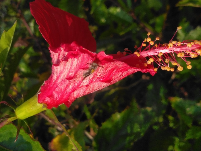 An image taken in Dulce Nombre de Jesús, Costa Rica, displays a close-up view of a vibrant red hibiscus flower, likely a Hibiscus rosa-sinensis type, positioned downwards. The flower's petals are a rich red, exhibiting a slightly textured or crinkled surface. A small, dark-bodied, fuzzy insect is observed situated within the interior of the flower's corolla, near the base of the central red staminal column. This column extends downwards, densely covered with numerous small, yellow-orange anthers. The flower is attached to a robust green pedicel, with a green calyx visible at the base of the petals. The background consists of blurred green foliage, indicative of an outdoor, natural environment under ambient daylight.