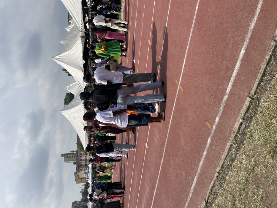 The image depicts an outdoor gathering on a red athletic track within a sports complex or large event ground in Ebute-Metta, Lagos, Nigeria