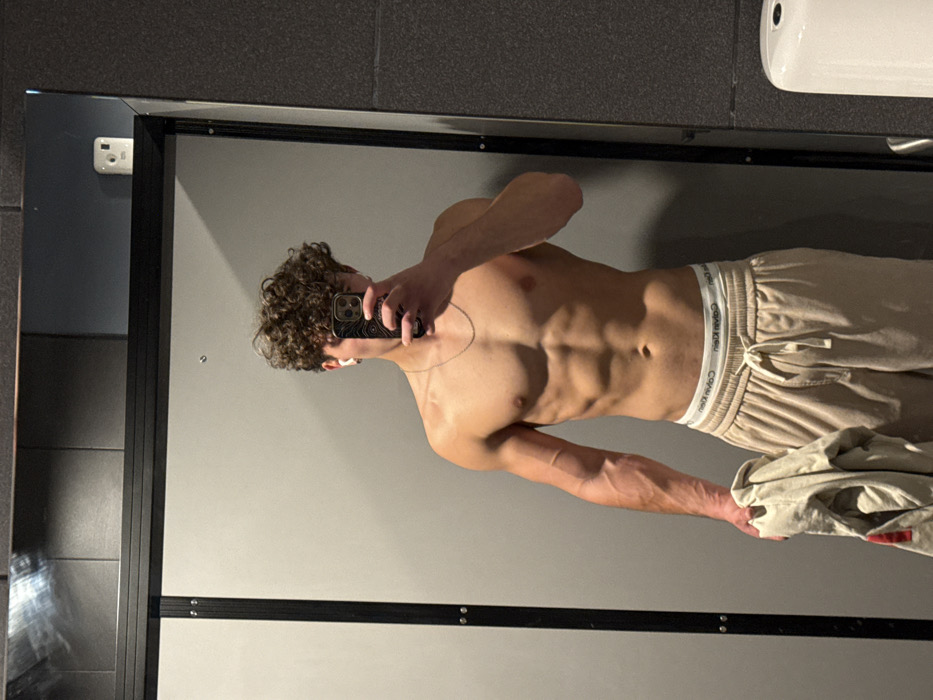 The image depicts a young male taking a mirror selfie in an indoor setting, likely a gym changing room or restroom, located in Chantepie, France