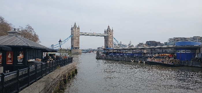 An outdoor wide shot captures a segment of the River Thames in London, United Kingdom, under an overcast sky. In the center, the iconic Tower Bridge stands prominently, its two Gothic-style towers connected by pedestrian walkways and a road deck, with suspension cables visible. The river, appearing dark and slightly choppy, flows towards the foreground. To the left, a dark-colored, single-story kiosk-like building with a grey, ridged roof and a decorative finial is situated on a stone embankment. Promotional posters are affixed to its exterior walls. In front of this building, a black metal fence encloses an outdoor seating area with multiple tables and chairs. Several individuals are seated at these tables. Bare tree branches are visible above and behind this structure. To the right, a series of dark floating pontoons or platforms extend into the river, forming a dock or pier. A blue building with white-framed windows is located on one of these platforms. Moored alongside the platforms are several boats, including a dark-hulled vessel adorned with numerous small lights, suggesting a leisure or dining establishment. Figures are discernible standing and walking on these platforms. The background beyond the river features a skyline with various urban buildings, including modern structures with multiple balconies. The overall lighting is diffuse due to the cloudy conditions.