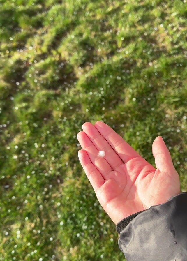 person's hand held out, palm up, with a small hailstone resting in the center. The background is a green lawn speckled with many other hailstones. The person is wearing a dark jacket. The camera remains mostly still, focusing on the hand and the hailstone as more hailstones fall into the hand and onto the lawn.