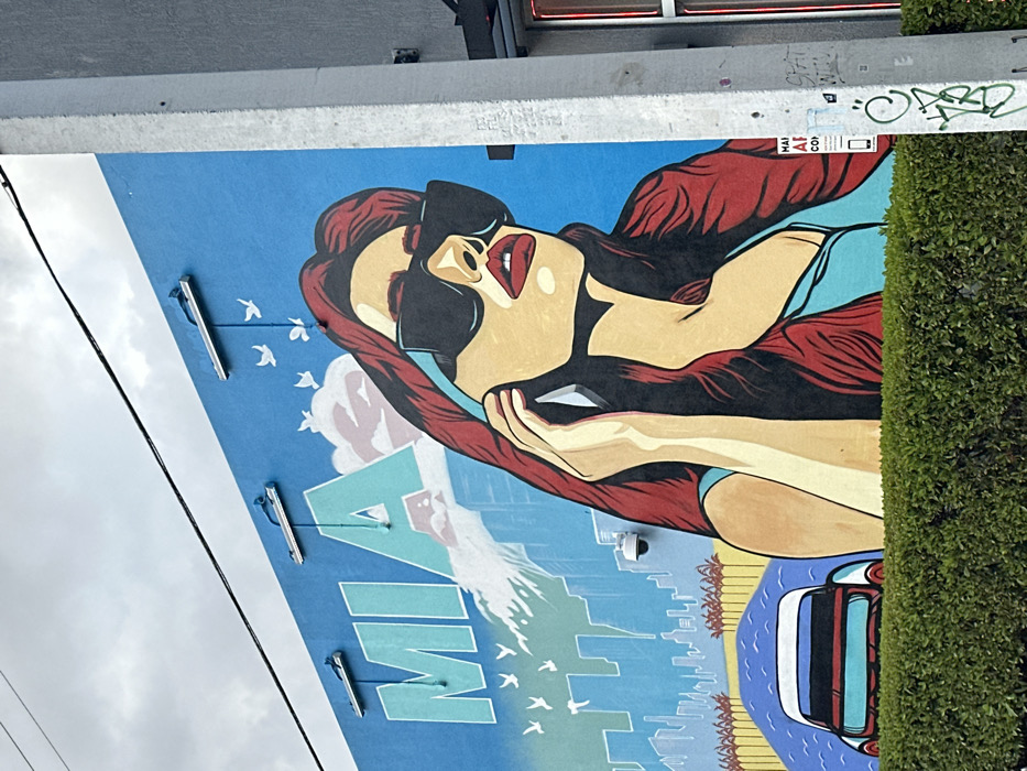 The image displays a large outdoor mural on a building wall in Miami, United States, beneath an overcast sky