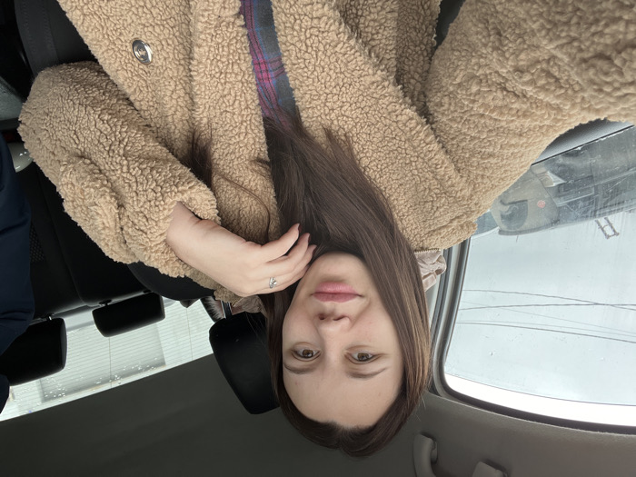 A young adult female is seated in the driver's seat of a vehicle in Leninavan, Russia. She possesses long, dark brown hair and a light complexion, looking directly at the camera with a slight smile. She is wearing a light brown, textured "teddy bear" or sherpa-style coat over a plaid shirt with red, blue, and black patterns. A silver-colored ring with a visible stone is present on the ring finger of her left hand, which is positioned near her chin. The car interior features black seating and headrests. Through the left front window, an overcast sky, utility lines, and indistinct large, dark vehicles or machinery are visible in the background. The right side of the image, visible through the rear window, shows a light-colored building with horizontal siding, and moisture droplets are apparent on the window glass, indicating an exterior urban or semi-urban environment.