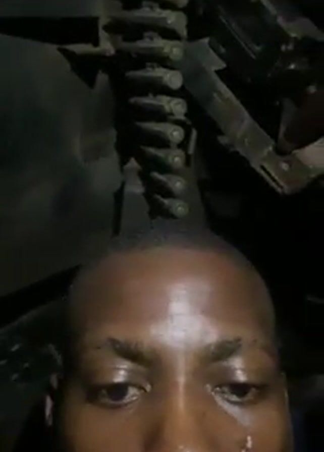 close-up view of a man's face, with a large, metallic object visible in the background. The man has dark skin, short hair, and a goatee. He appears to be sweating slightly. The object behind him is dark and appears to be a mechanical component, possibly part of a machine or vehicle. The lighting is dim, making it difficult to discern finer details. The video is shot from a low angle, looking up at the man's face and the object.
