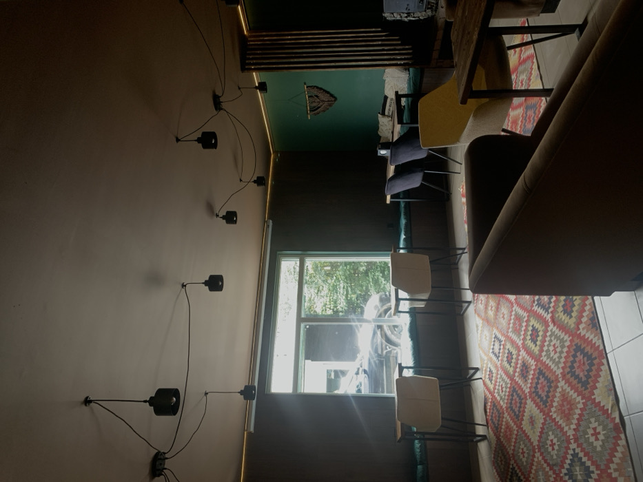 This image captures the interior of an unoccupied commercial establishment, likely a cafe or lounge, situated in Yasinia, Ukraine. The room features a light-colored ceiling from which numerous black, industrial-style pendant lights are suspended by exposed black electrical cords. The wall to the left is dark brown, transitioning to a dark teal or green wall on the right. A narrow, horizontal strip light runs along the upper perimeter of the walls. A large, multi-paned window on the dark brown wall provides natural light, revealing a partial view of a dark vehicle and dense green foliage outside. The floor is covered with light-colored tiles, over which a large rug with a multi-colored geometric pattern in red, beige, and grey is laid. Seating arrangements include two beige chairs with black metal frames at individual dark wooden tables positioned against a low built-in bench with dark teal cushions along the windowed wall. Further into the room, against the dark teal wall, a long wooden table is accompanied by four upholstered chairs (two dark blue, two dark grey) and a built-in bench with light-colored cushions and decorative pillows. In the foreground right, a portion of a brown upholstered sofa is visible. To its left, a yellow upholstered chair is positioned next to a dark wooden table with black metal legs. A macrame wall hanging and vertical wooden slat panels serve as decor on the dark teal wall. No individuals are present in the scene.