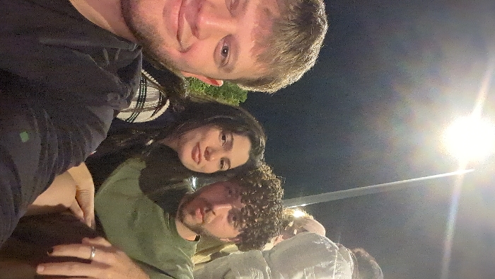 The image depicts three individuals at night in Modiin-Maccabim-Reut, Israel. In the foreground on the left, a light-skinned male with light brown hair smiles directly at the camera, wearing a dark-colored hooded garment with a small green emblem visible on the left sleeve. Positioned beside him is a female with dark hair, looking towards the camera with a slight pout, dressed in a dark garment with a subtle plaid pattern. To her right, a light-skinned male with dark curly hair and a beard looks towards the camera with a neutral expression, wearing an olive green t-shirt. A silver ring is visible on his left ring finger. A partially visible figure is situated behind the male on the right. The scene is illuminated by a bright, overhead artificial light source on a pole in the upper right quadrant, producing a noticeable lens flare. The background is dark and indistinct, with some faint foliage visible. The individuals appear to be posing for a photograph.