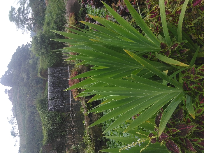The image displays a lush, verdant outdoor landscape, reportedly located in Kladno, Czechia. In the immediate foreground, a cluster of prominent, sword-shaped green leaves, possibly from a Gladiolus plant, occupies the lower central portion of the frame. These leaves exhibit a consistent vibrant green hue with faint longitudinal veins. Beneath and interspersed among these, numerous smaller plants with variegated, deeply lobed leaves are visible, primarily featuring dark reddish-purple centers and contrasting green edges. A slender stalk with small, light-colored flowers is partially visible on the far left. The midground features an artificial waterfall, approximately 2-3 meters in height, cascading water over a dark, rectangular retaining wall into a visible pool or stream below. The waterfall structure and its immediate surroundings are heavily overgrown with green foliage, including climbing vines and various shrubs. Small patches of red-leafed plants are present near the base of the waterfall. The background consists of a large, densely vegetated hill covered with numerous trees and thick green foliage, rising behind the waterfall. On the summit of this hill, several faint structures, possibly buildings or a monument, are discernible against a bright, uniformly overcast sky. No individuals or animals are present in the scene, and no specific actions or interactions are depicted. The overall environment appears to be a cultivated park or garden setting.