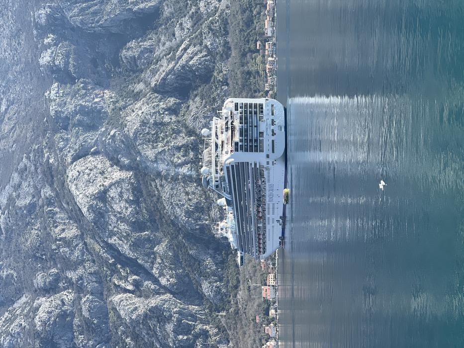 - "A large white cruise ship, identified as "Princess Cruises" and "Regal Princess," is centrally positioned in calm, blue water within a bay near Bogdašići, Montenegro" by FM-CjoWV2, licensed under CC BY 4.0